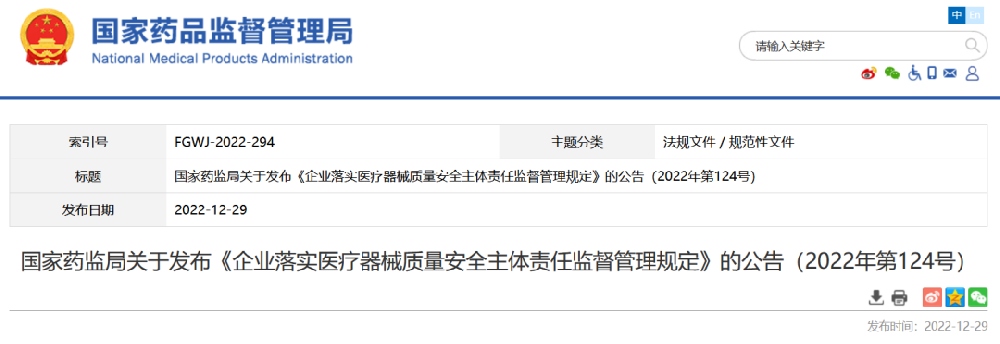 2022年12月29日,國家藥品監(jiān)督管理局發(fā)布《企業(yè)落實醫(yī)療器械質量安全主體責任...
